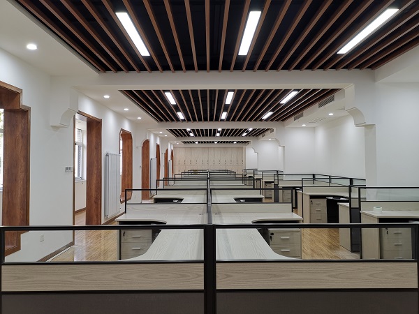 在該項目的裝飾設計中,設計院充分利用原建筑條件,在盡可能節約裝修成本的基礎上,將辦公環(huán)境打造成為簡(jiǎn)約優(yōu)雅、別具一格的空間。改造區域原為多個(gè)小型辦公室,并且處于院落的南面,采光極差。設計師經(jīng)過(guò)與領(lǐng)導協(xié)商,除保留個(gè)別房間外,將剩余的幾個(gè)辦公室隔墻拆除,從而獲得了一個(gè)大而開(kāi)敞的辦公區,可容納36個(gè)寬敞工位,并取消此辦公區域所有的門(mén),且將原窗戶(hù)臺面降低至距地40厘米高,最大可能的利用了自然采光。色調的選擇上,墻面大面積采用白色乳膠漆與硅藻泥,一定程度上也彌補了自然采光的不足。