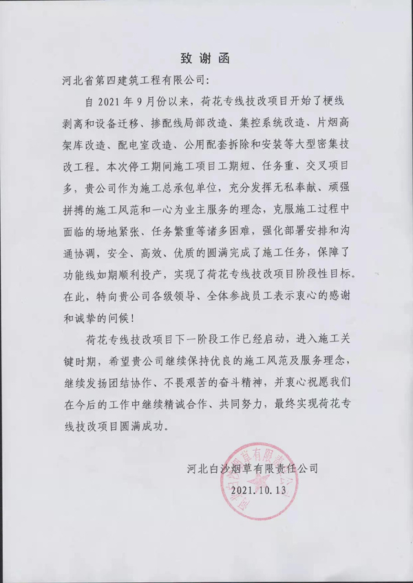 一紙致謝函,字字鼓人心!10月13日,三分公司中煙項目部收到業(yè)主河北白沙煙草有限責任公司發(fā)來(lái)的致謝函,感謝項目部克服場(chǎng)地緊張、任務(wù)重等諸多困難,圓滿(mǎn)完成施工任務(wù),實(shí)現了荷花專(zhuān)線(xiàn)技改項目階段性目標。