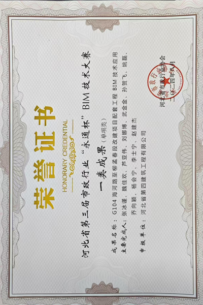 8月16日,七分公司收到了河北省市政行業(yè)協(xié)會(huì )頒發(fā)的榮譽(yù)證書(shū)。分公司參賽的“G104海河路至柳孟春段改建項目配套工程BIM技術(shù)應用”成果,在河北省第三屆市政行業(yè)“永通杯”BIM應用技能大賽中被評為一類(lèi)成果。
