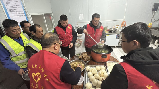項目務(wù)工人員大多是當地村民,離家較近的務(wù)工人員常自帶飯菜加熱食用。然而,天氣寒冷或加班時(shí),飯菜容易變涼??紤]到這一點(diǎn),項目部志愿者團隊聯(lián)合食堂師傅,為工人們準備了熱餐器具,并額外提供免費雞蛋湯,讓大家在繁忙的施工之余,感受到家一般的溫暖。這一舉措不僅讓工友們吃得安心、干得舒心,更激發(fā)了大家的工作熱情,為施工生產(chǎn)注入了強勁動(dòng)力。