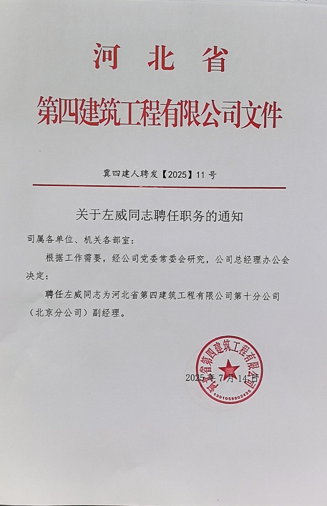 關(guān)于左威同志聘任職務(wù)的通知